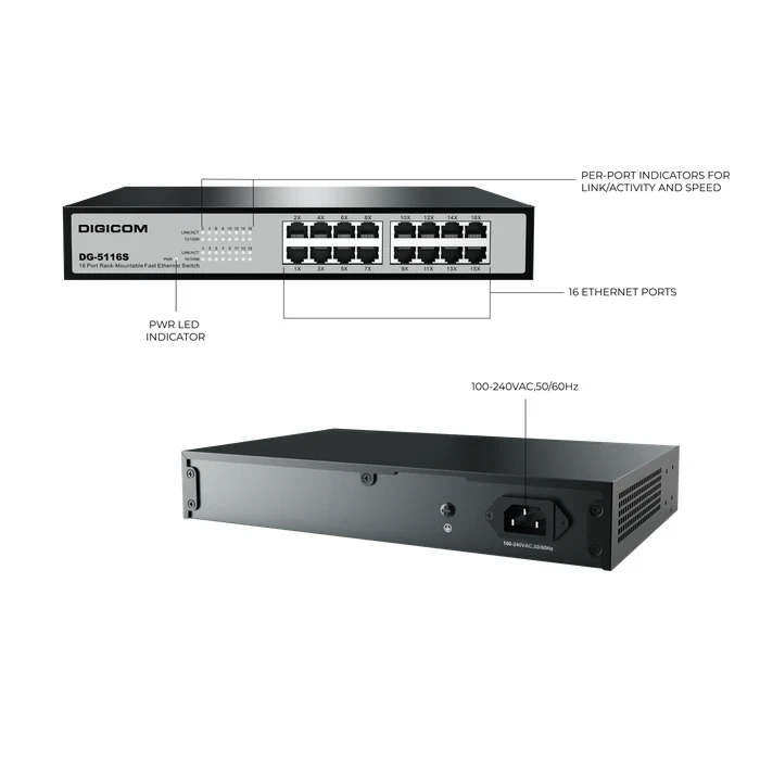 Digicom 1U Rack Logic: Engineered by Digicom in a standard 1U form factor (280 * 180 * 44 mm) for seamless integration into 19-inch networking racks and server cabinets.