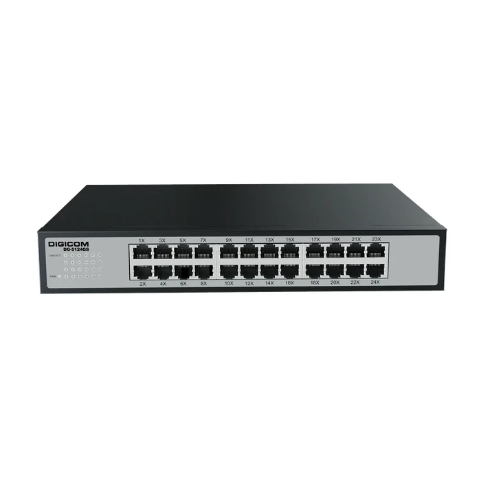 Digicom 24-Port High-Density Logic: Engineered by Digicom to provide twenty-four full 1000 Mbps Gigabit ports, offering a massive expansion capacity for enterprise workstations and server arrays.