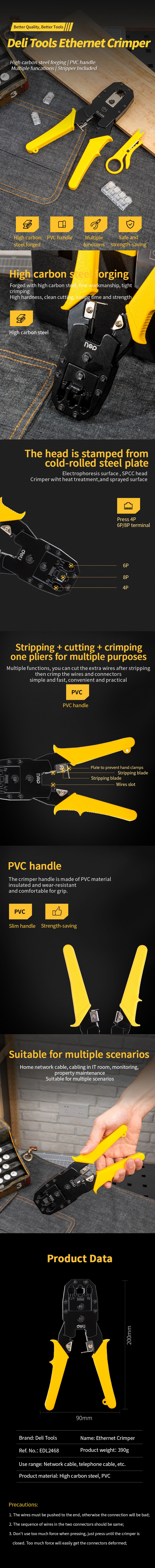 Universal Crimping Compatibility: Designed to handle three common connector types: 4P (RJ10/RJ9), 6P (RJ11/RJ12), and 8P (RJ45) (Size & Spec), making it a versatile tool for various networking and telecommunications needs.