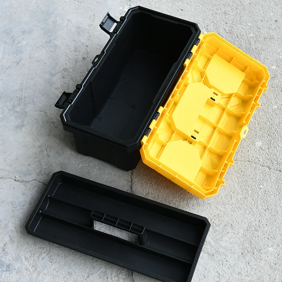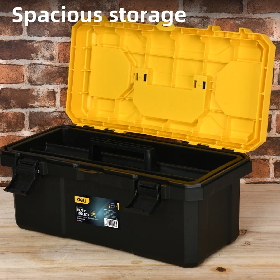 Efficient Organization: (Inferred) Features an integrated carrying handle, strong locking latches, and usually includes a removable inner tray for organizing small parts and frequently used tools.