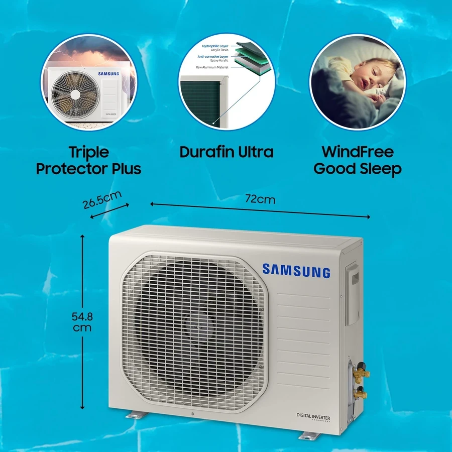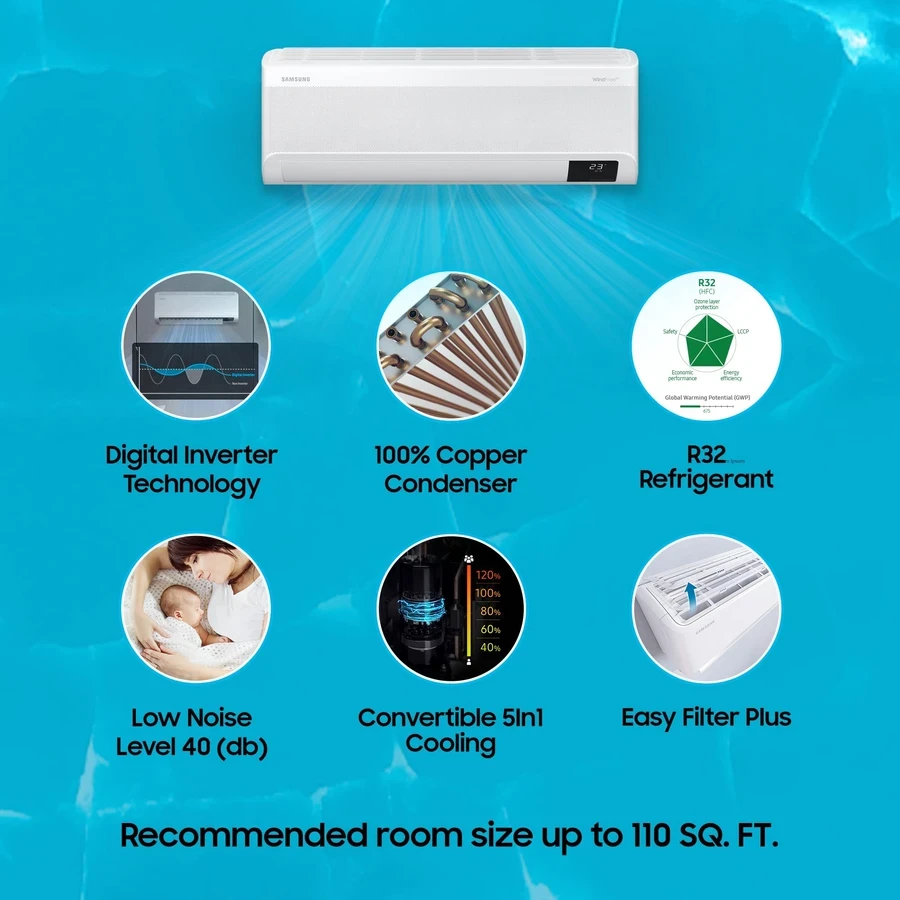 Efficient 1.0 Ton Cooling: Perfectly sized for small to medium-sized rooms, providing rapid and consistent cooling through Samsung's advanced digital inverter technology.